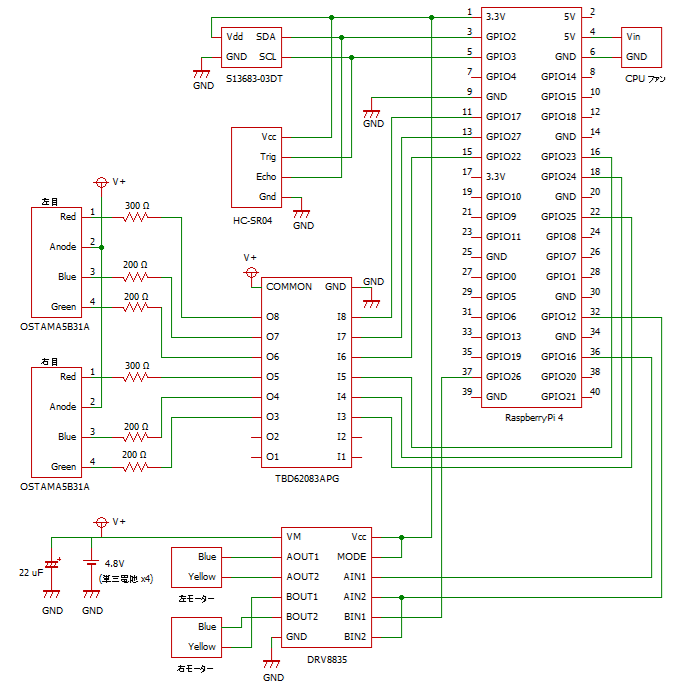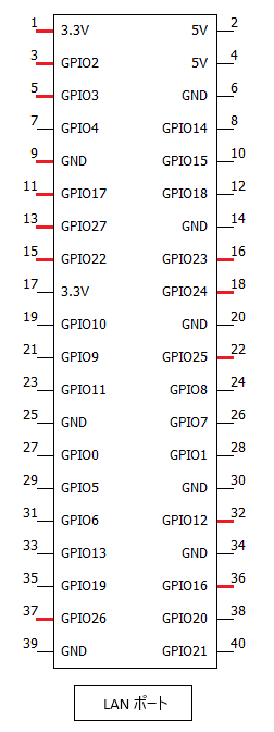下図の赤で塗った Raspberry Pi の IO ピンにオス-メスジャンパ線を取り付けます。