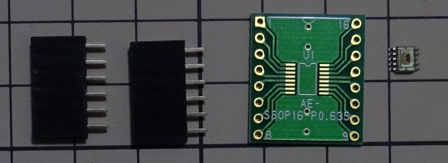 DIP変換基板 SSOP16 0.635mm に カラーセンサー と ピンソケット(メス) 1×6 (6P) を取り付けます。 DIP変換基板とカラーセンサーの足のピッチが合っていないので *1、カラーセンサーの 1、5、6、10 番ピンだけはんだ付けします。 DIP変換基板とカラーセンサーのはんだ付けはフラックスを使うことをお勧めします。 カラーセンサーのピン番号は こちら を参照してください。