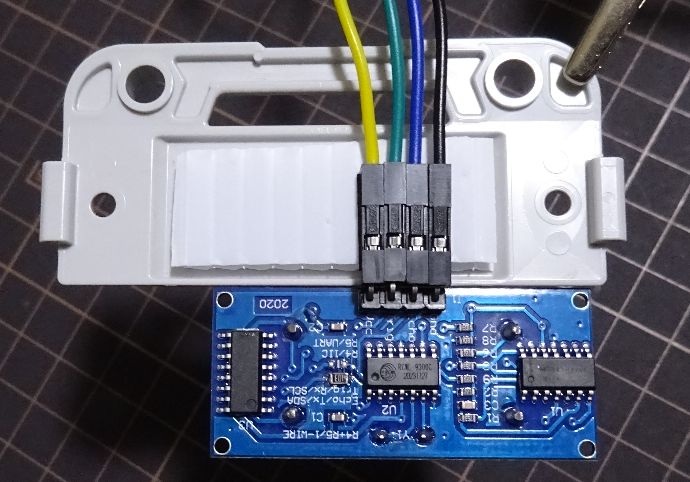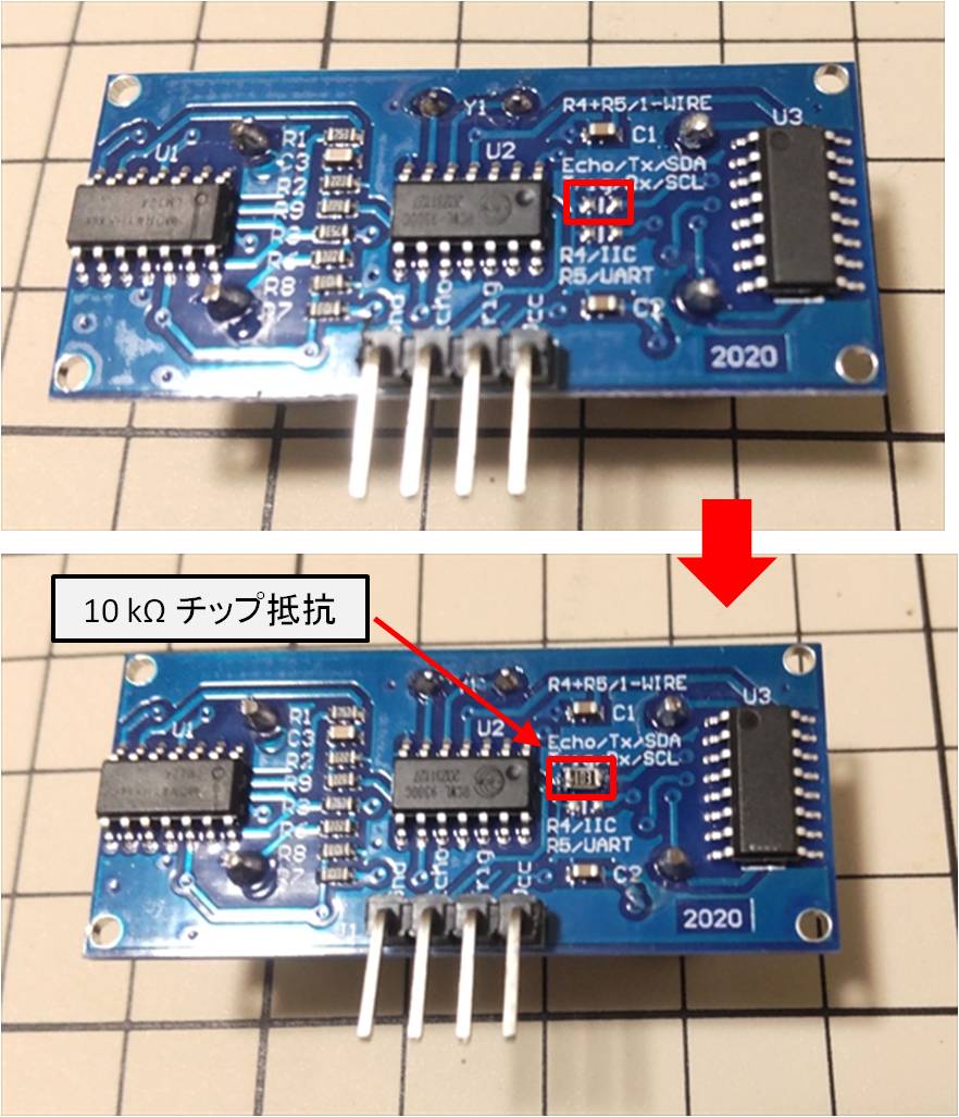 距離センサーの裏面のジャンパー取付位置 R4 (下図参照) に 10 kΩ のチップ抵抗をハンダ付けします。