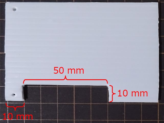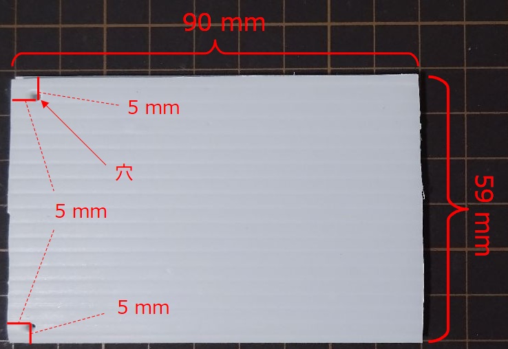 プラスチック段ボールを 59mm x 90 mm の長方形に切り取り、下図の位置にきりで穴をあけます。