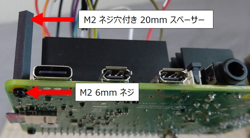 M2 6mm ネジ と ネジ穴付き 20mm スペーサーを Raspberry Pi 4 の SD カードスロットがある方の穴に取り付けます。