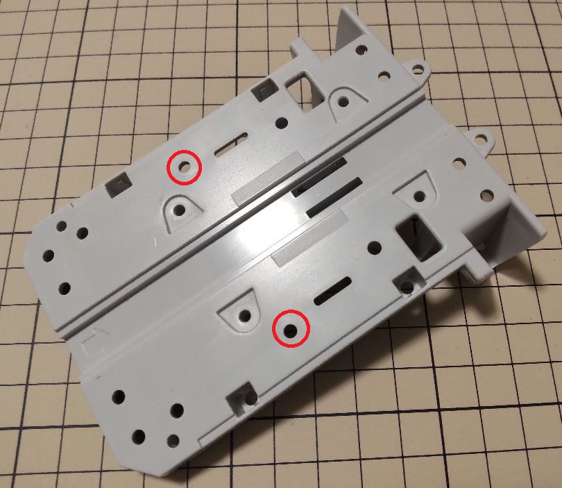 Raspberry Pi の USB ポート側の穴と下図の赤丸で囲った穴を合わせて台座の下から M2 6mm ネジ を差し込み、 それに M2 ネジ穴付き 20mm スペーサー を Raspberry Pi ボードの上から取り付けます。