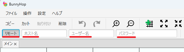 ダウンロードページ から「BunnyHop」をダウンロードして、ZIP ファイルを展開します。 出てきたフォルダの BunnyHop.exe をダブルクリックして BunnyHop を起動します。 アプリケーション画面左上の「ローカル」ボタンを押して「リモート」に変更してから、「ホスト名」「ユーザー名」「パスワード」に手順 3 で Raspberry Pi OS に設定した同名の内容を入力します。