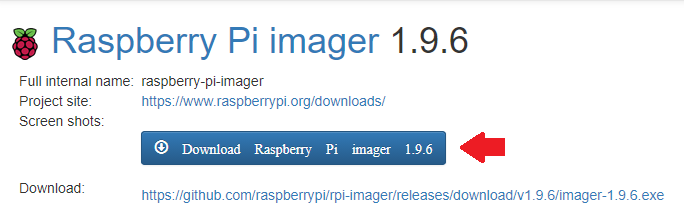 以下のページから Raspberry Pi Imager (バージョン 1.9.6) のインストーラをダウンロードします。