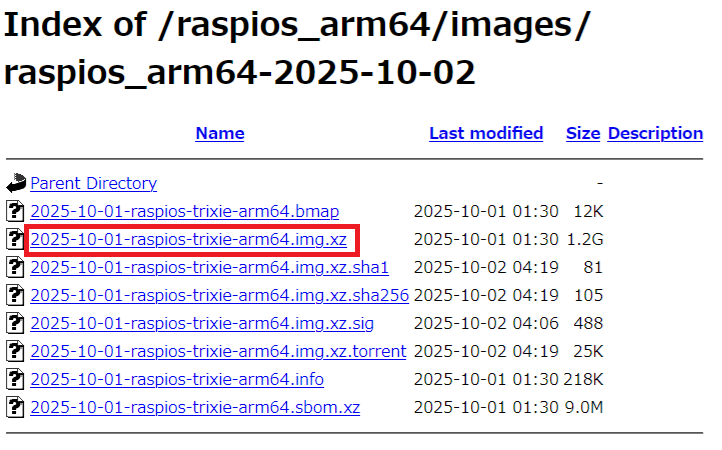 以下のページから Raspberry Pi OS (リリース日 2025-10-01) のイメージファイルをダウンロードします。