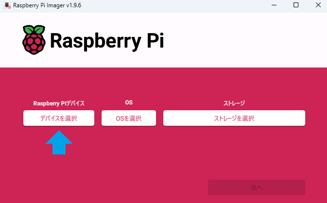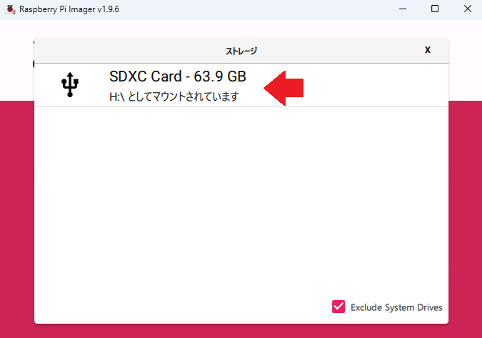 「ストレージを選択」を選択して Raspberry Pi OS を書き込む microSD カードを選びます。