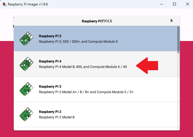 microSD カードを SD カードリーダに入れて PC につないでから、Raspberry Pi Imager を起動します。 「デバイスを選択」を選択して「Raspberry Pi 4」を選びます