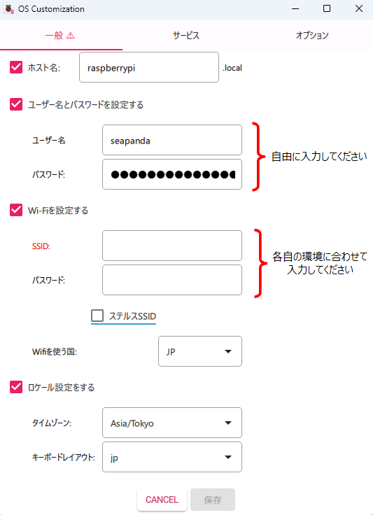 「ユーザー名」「パスワード」「SSID」「(Wi-Fiの) パスワード」を設定します。「ホスト名」も変更して問題ありませんが、本記事では 「raspberrypi.local」 のままにしておきます。 その他の項目は下図のように設定ます。