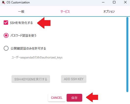 「サービス」タブクリックして、パスワード認証による SSH を有効化します。「保存」を選択します。