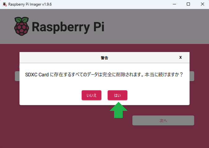 microSD カードのデータが消えるという警告が出るので「はい」を選択します。